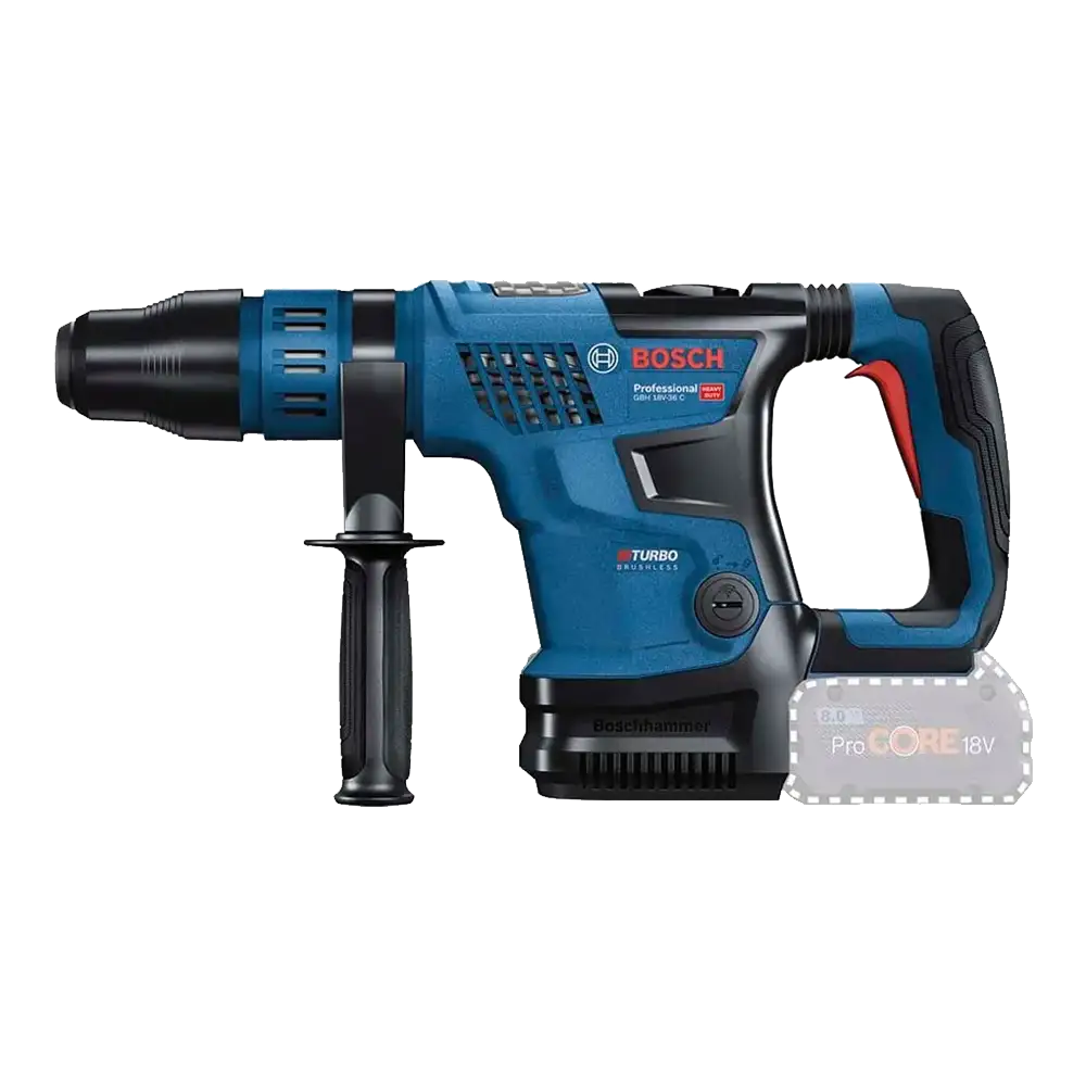 EL GBH 18V-36 C ES PARTE DE LA LÍNEA BITURBO BRUSHLESS DE BOSCH, DISEÑADO PARA ENTREGAR EL MÁXIMO RENDIMIENTO EN PERFORACIÓN Y DEMOLICIÓN CON BATERÍA. EQUIPADO CON TECNOLOGÍA AVANZADA QUE RIVALIZA CON HERRAMIENTAS CABLEADAS.